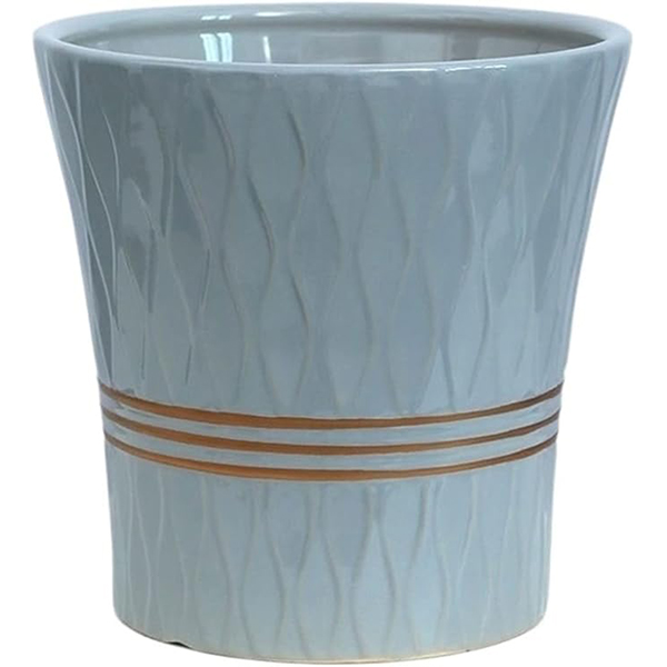 Šis elegantais gaiši zilais keramikas pods apvieno klasisku formu ar mūsdienīgu dizainu. Tā virsma rotāta ar smalku viļņotu rakstu un trīs horizontālām zeltainām līnijām, kas piešķir izstrādājumam īpašu šarmu. Spīdīgā glazūra rada vieglu atspīdumu, kas padara podu par izteiksmīgu akcentu jebkurā telpā. Ideāli piemērots gan dzīvajiem augiem, gan kā dekoratīvs trauks mājokļa dizainā. Izgatavots no kvalitatīvas keramikas, kas nodrošina izturību un ilgmūžību. Šis pods lieliski iederas gan modernā, gan klasiskā interjerā.